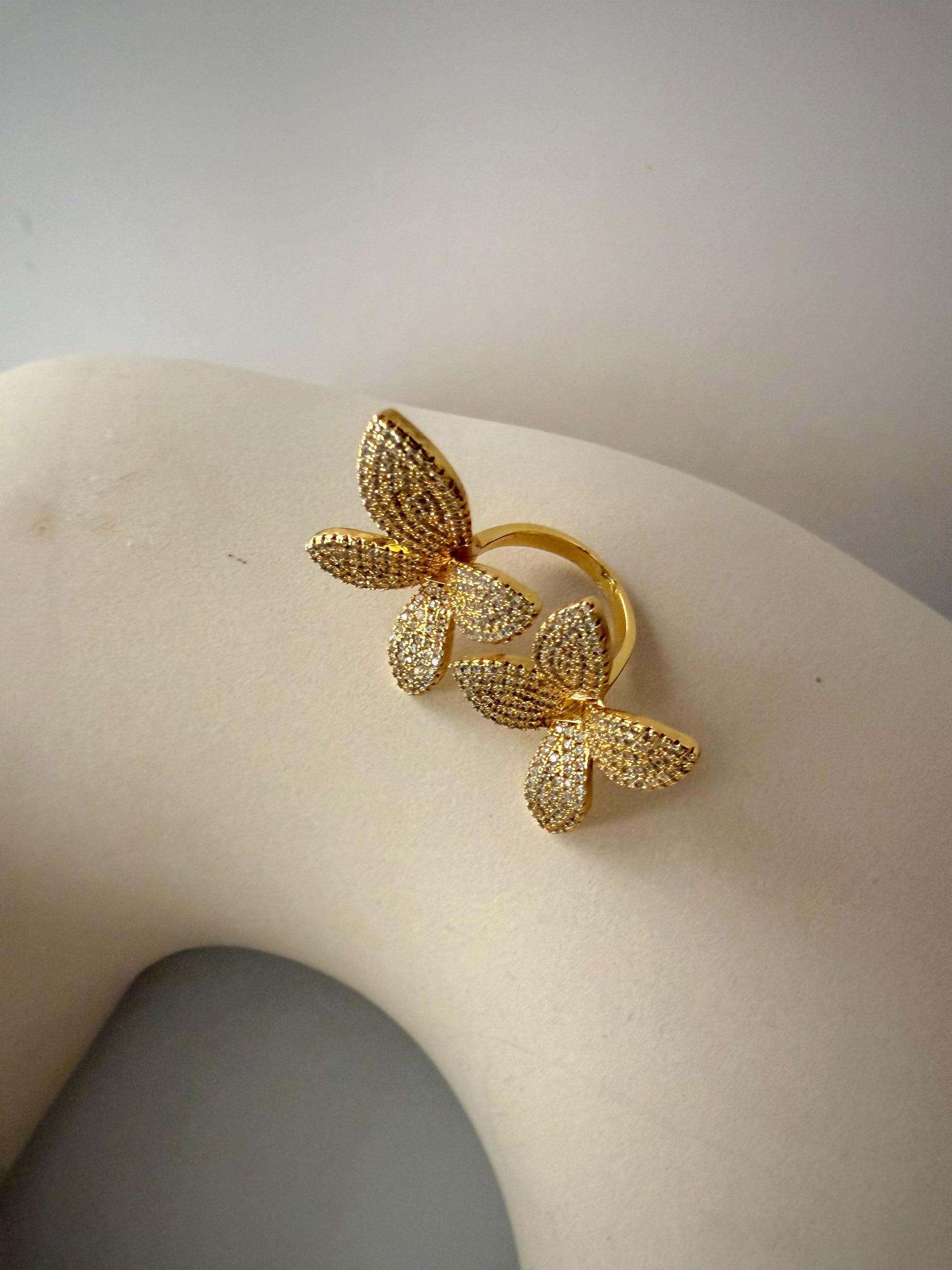 Designed with two dazzling floral motifs, this statement ring features pavé-set zirconia petals that shimmer with every move. Crafted to perfection, it’s a piece that turns heads whether worn solo or stacked. Available in both radiant gold and icy silver.