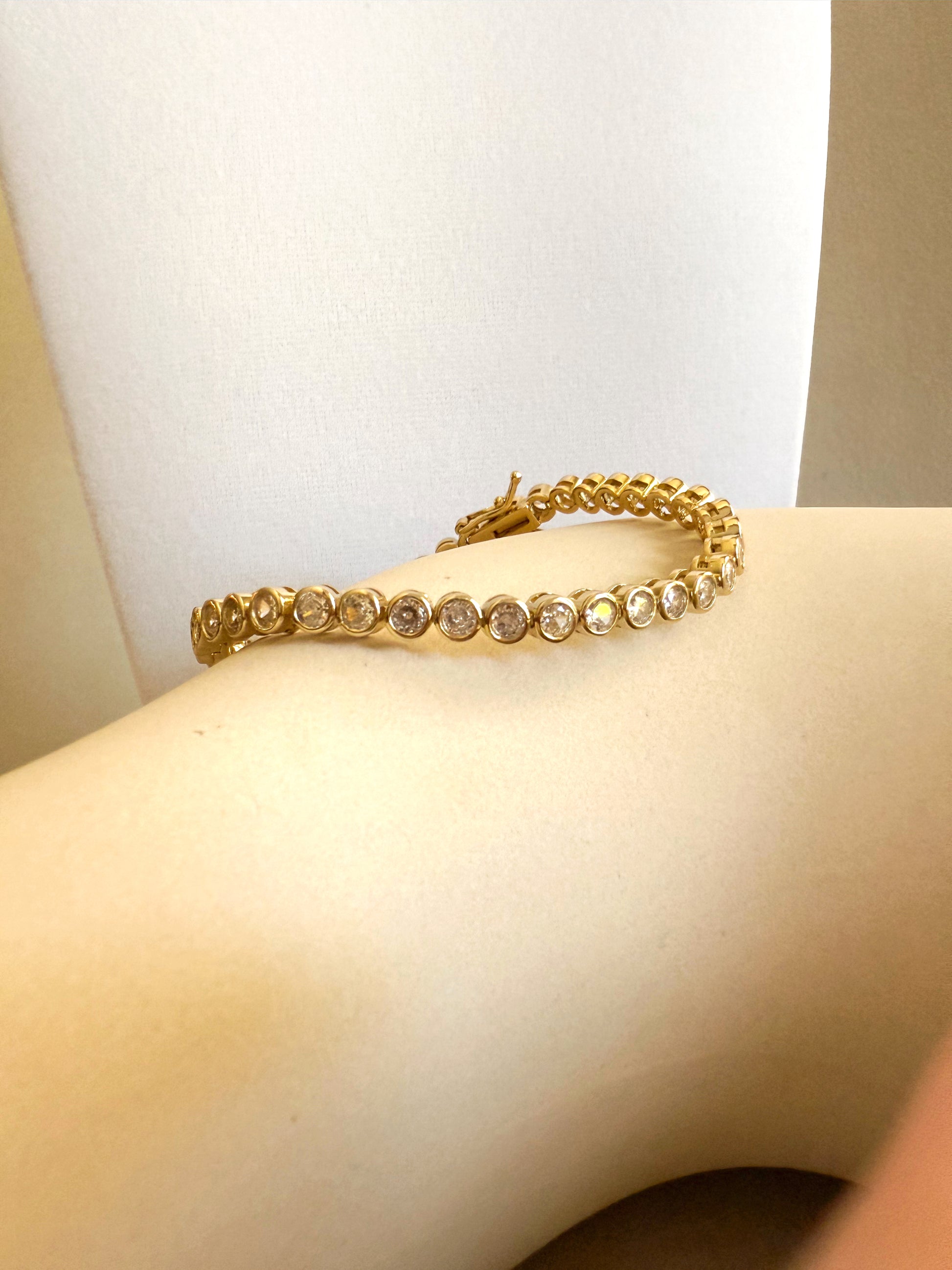 Indulge in effortless luxury with our 4mm Round Tennis Bracelet. Adorned with shimmering Cubic Zirconia Stones, this timeless piece elevates any outfit. Crafted with 18K Gold Filled material, it offers a tasteful and exclusive touch. Available in 6, 6.5, and 7 inch lengths for a perfect fit.