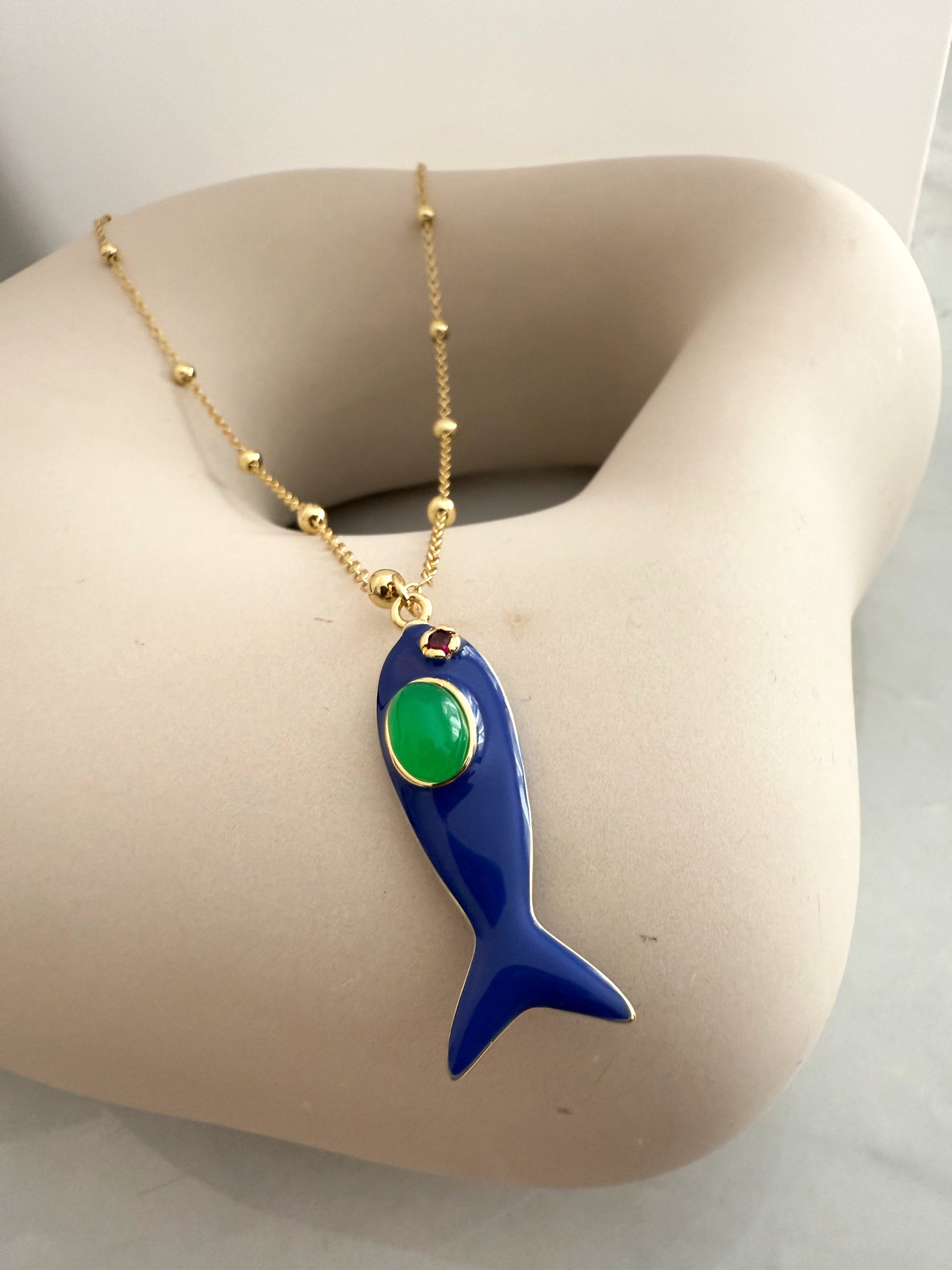 Indulge in the beauty of the Enamel Fish Necklace. This exquisite piece features a stunning enamel fish charm on a luxurious goldfield chain, measuring at an elegant 20 inches. Elevate any look with this sophisticated and exclusive necklace that is sure to catch the eye of all who see it.