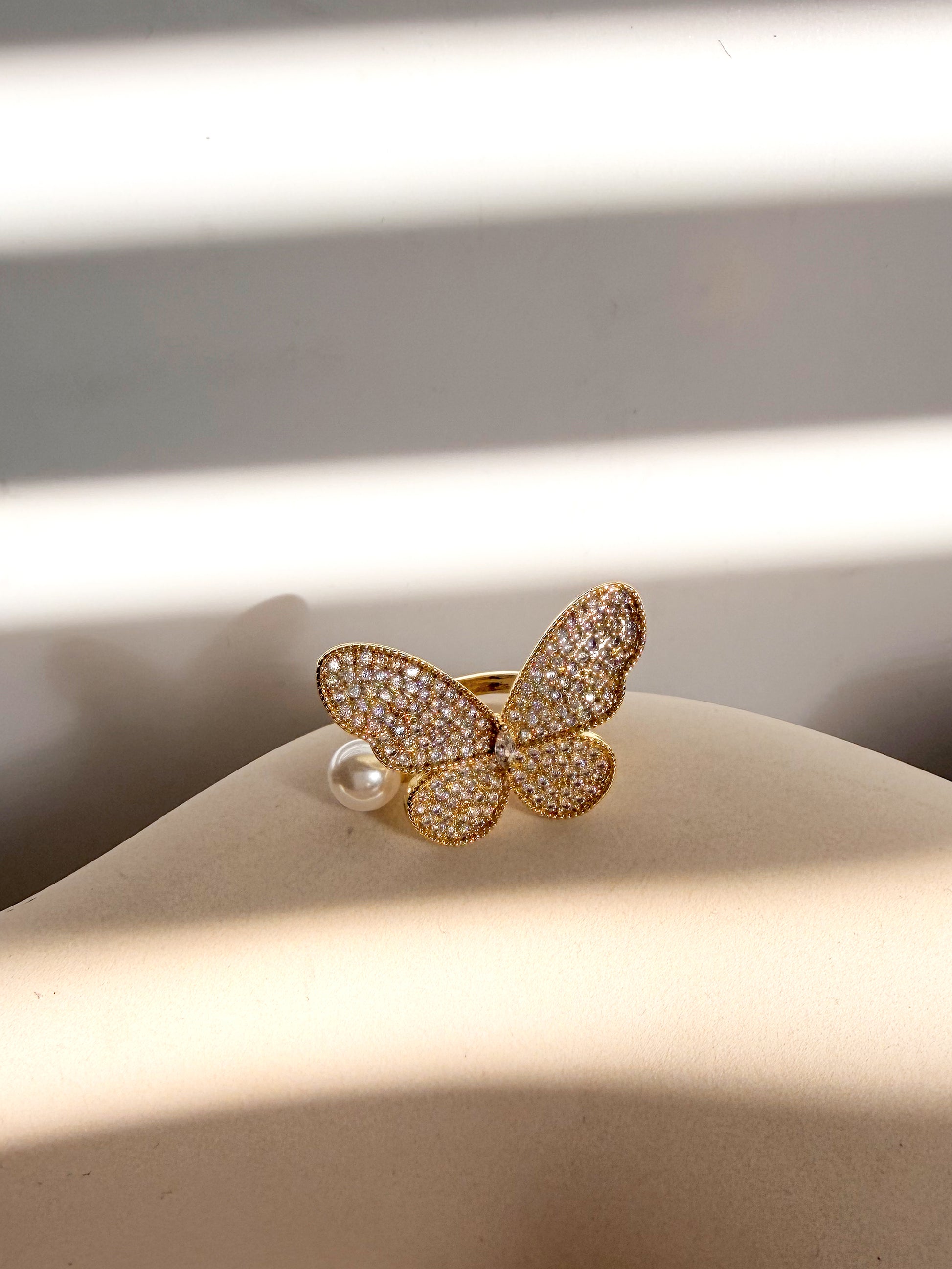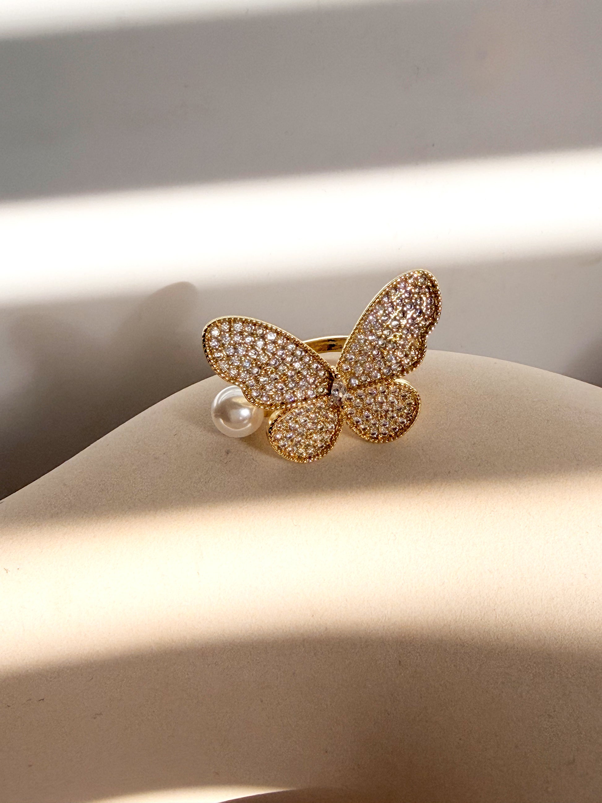 Embodying the ethereal grace of nature, the Sparkling Butterfly Ring is a timeless piece where shimmering pave zircon dances delicately amidst a lustrous gold plating. Adorned with a singular pearl, its adjustable design ensures a perfect fit, while the butterfly silhouette evokes a sense of transformation and elegance, enhancing the wearer’s innate charm.
